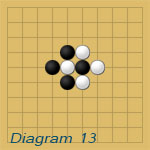 Nu kan wit een steen plaatsen in het oog van de zwarte groep (schema 13) en dit zal de zwarte steen dan weer vangen. Wanneer we de zwarte steen verwijderen komen we weer in situatie van diagram 10. Dit kan eindeloos worden herhaald en deze situatie heet "ko".