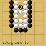 Nu zwart probeert wit te verhinderen om twee ogen te maken en plaast een steen (schema 17), maar wit kan nu een 4de steen plaatsen waardoor het onmogelijk is dat zwart de witte groep vangen.