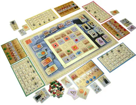 Sort the game tiles by their back sides (A & B). Shuffle the 27 A game tiles face down and place them face up randomly on the 5 x 5 grid on the game board (= the playing area).