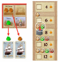 Example: red wants to move his success marker in the taxes column from row 2 to row 3. He takes 1 pepper, 1 cinnamon, and 2 ships from his play area and puts them back in the supply to pay for the move.