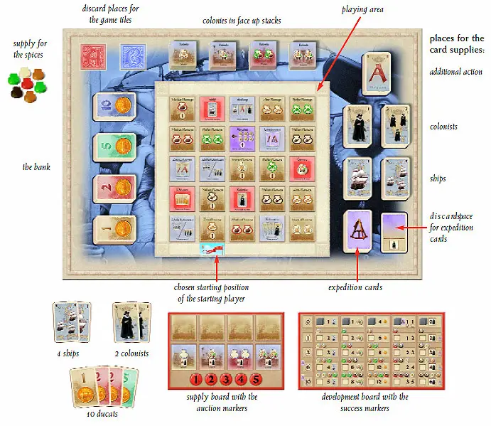 Place the ship cards, colonist cards, ducat cards, and additional action cards on the appropriate spaces on the game board. Players may make change with the ducat, ship, and colonist cards at any time. For example, if a player has only a 3 ship card and needs to pay 2 ships, he will get 1 ship in change.