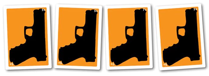 When you aim a Gun, you must announce the name of the player at whom you are aiming. You must also place the Gun in front of you on the table with the barrel pointing toward that player.