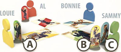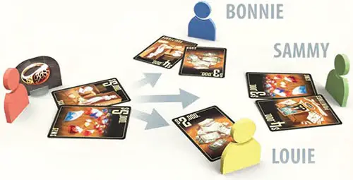 Example: Now Al gets to split up the Loot. He knows he needs more Yes votes than No votes to stay the Boss, so he tries to make some friends: He offers 2 Loot cards to Bonnie and 2 to Sammy. He keeps the best 2 Loot cards for himself, of course, and tries to hedge his bets by tossing the last Loot card to Louie.