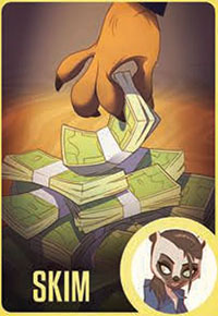 Skim allows a player to take the top Loot card from the Loot Pile and add it to their Stash (it is not taken from the face up Loot cards being voted on-always the top face down card from the deck).