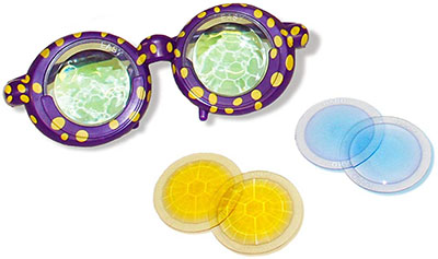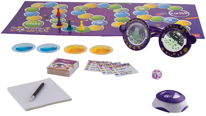 The color of the space the pawn lands on determines which challenge to draw and which lenses are used in the glasses.