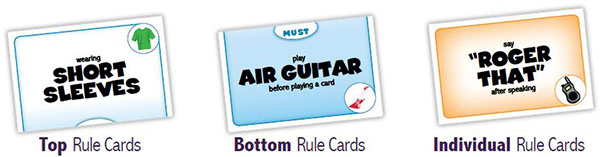 Included in the card deck are 6 blank Create-Your-Own-Rule Cards (3 blank Bottom Rule Cards & 3 blank Individual Rule Cards). When you think of your own funny rules, write them on these cards and then shuffle them into the card deck.