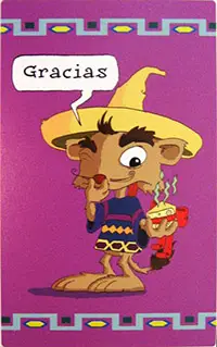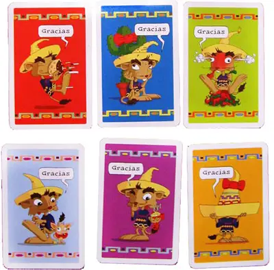Next, he decided which of the two face-up cards (of the triplet) to keep, adding it to his play area face up. Finally, he gives the other face-up card (of the triplet) to any one of his opponents, placing it face up in the opponent's play area. The opponent, naturally, responds with a heartfelt",Gracias!