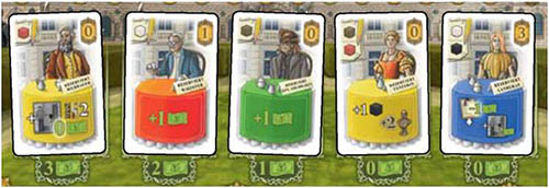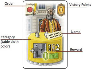 In order to make your hotel successful, you will have to attract many guests and meet their needs and wishes. Once you fulfill a guest's requests, they will stay at your hotel and bring you rewards. The guests are quite picky, though, when it comes to taking a room: Nobles (blue cards) only take blue rooms, Artists (yellow cards) only yellow rooms, and Citizens (red cards) only red rooms. Only Tourists (green cards) are pleased with any room they can get.