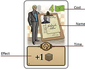 There are 12 Politics cards, but only 3 are used in each game. If you meet the requirements of a card on your turn, you can place a wooden disk on the card and you immediately receive the printed number of Victory Points. You can only place one wooden disk on each card.