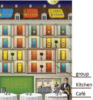 Your Hotel board features a little Cafe which can host 3 guests. Your Kitchen is where you prepare the dishes they order, and your Office is where you play your actions and maintain your money and staff.