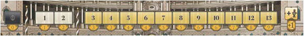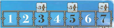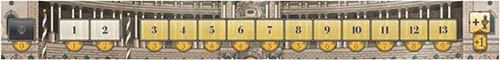 Then each player must move their wooden disk a number of spaces back on the track: 3 spaces after the first, 5 spaces after the second, and 7 spaces after the third Emperor Scoring.