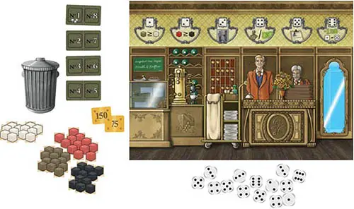 Example: There are 4 dice showing "6", but only 1 die showing "2". You pay 1 krone and take 2 wine and 2 coffee.