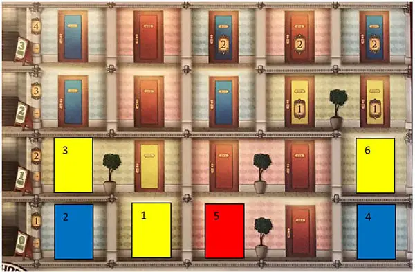 If the acquired guest is BLUE / RED / YELLOW, the Automa will place a closed room tile trying to complete the rows of the hotel from bottom to top and from left to right. If the acquired guest is GREEN, the Automa will place a closed room tile trying to complete the columns of the hotel from right to left and from bottom to top;