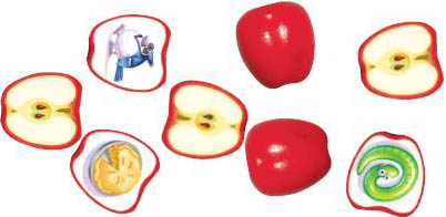 The Orchard Keeper takes all eight apple halves, shakes them and rolls them onto the playing surface. Once they land, all other players, without taking turns, race to count the total number of apples scattered in play and be the first to shout out the correct number.