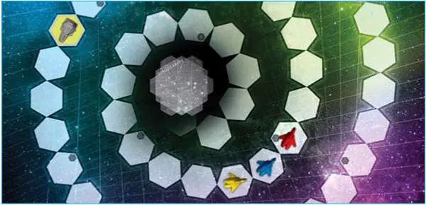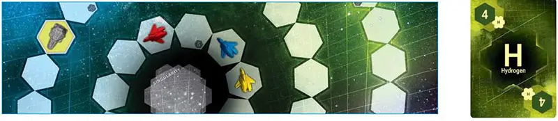 Since Red was only on the #6 space to start with, he ends up back in the Singularity. When you make your move, the Yellow spaceship is nearest, so you move towards and past it 8 spaces.