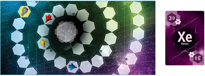 However, you don't have many late-letter cards . The Xenon card, though, moves you away from the nearest spaceship. This will move you forward on the board towards the Warp Gate, unless Yellow manages to get ahead of you before your X resolves.