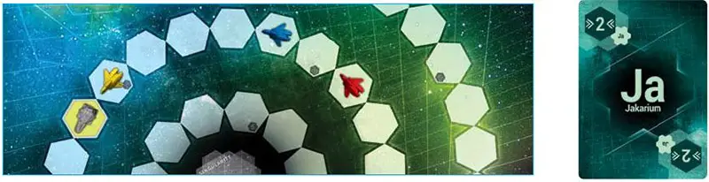 Only one Fuel Card is left in your hand. You have no choice but to play it in Movement Phase 6. Your Jakarium (an element never before encountered) ends up resolving first and its Tractor Beam ability is going to move each spaceship on the board towards you by 2 spaces.