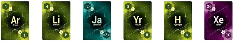 The 26 Fuel Cards are each uniquely lettered from A to Z. Each card represents a different element your crew has mined or gathered from the nearby dust clouds and asteroids. These basic elements are all you can find to fuel your spaceship.