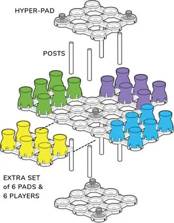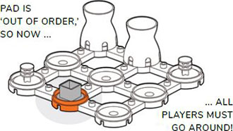 Placed on the grid-set before play, a hyper-pad is a special pad 'node.' Any marker landing on it will beam out - to any other open hyper-pad - of your choosing. This travel does not count as an extra move.