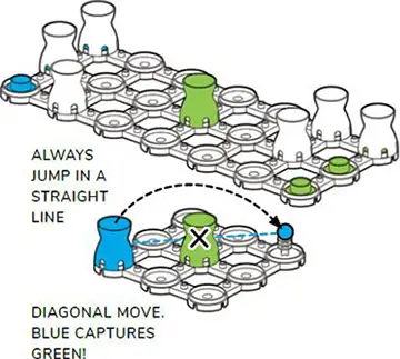To capture a marker, you jump over them - in a straight line - into an empty pad. Both pawns and kings can capture each other, but pawns cannot go backwards at any time.
