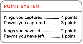 Once you land on any opponent's home-row (the color-keyed kingerizer) you get kinged! Flip over your pawn - and it's now a king. This is a major advantage.