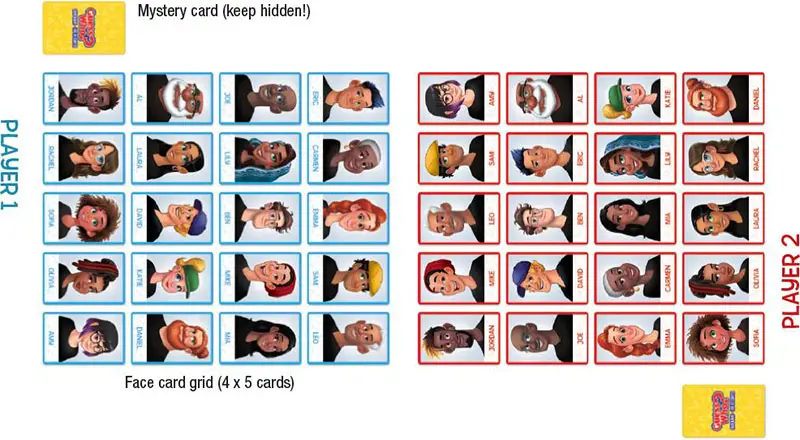 Shuffle the yellow Mystery cards. You each take a card featuring a Mystery Character from the top of the deck, look at it without letting your opponent see, and place it face down next to your Face card layout.