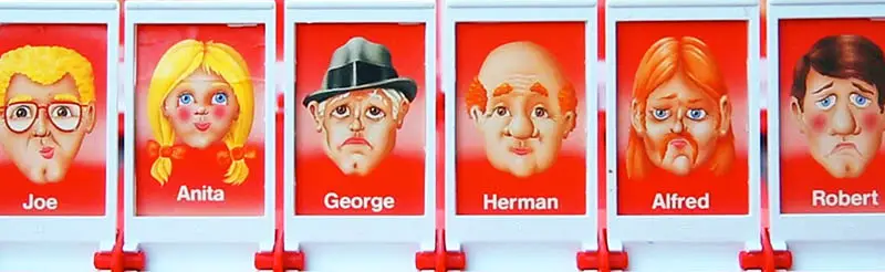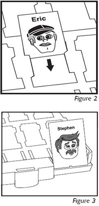 Hair and eye colors are different; some faces have rosy cheeks, beards, mustaches, or big noses; some are wearing hats or glasses. As you play, you'll notice several other differences among the gameboard faces.