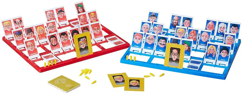 You must say "both" or "either" when asking questions about the Mystery People. For example, you may ask, "Do both of your people wear glasses?" or, "Does either of your people have black hair?" Be very careful when eliminating gameboard faces - and remember which questions you've asked!