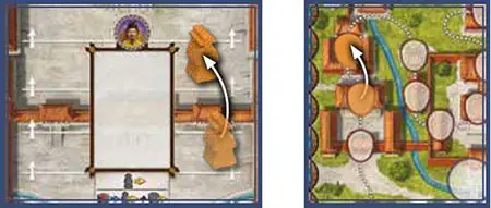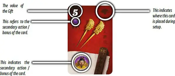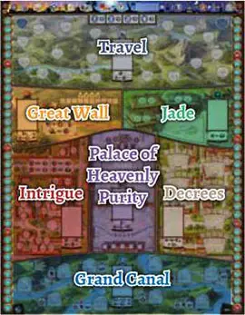 In the Day Phase, players perform various actions by exchanging Gift Cards with the Officials working in the Forbidden City, represented by the 7 Card locations on the Game Board.