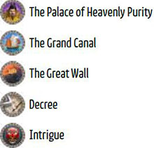 Place all players' Intrigue markers on the starting location of the Intrigue track, with the starting player's marker at the bottom, and the last player's on top. This marker will be used to indicate your amount of influence in the Forbidden City. It will resolve all ties in the game and delivers Intrigue benefits.