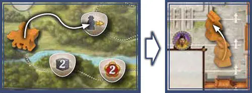Remove 2 Servants from your Servant pool to advance your Envoy 2 steps on the Palace track AND move your Intrigue marker forward 1 step on the Intrigue track.