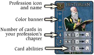 Each card has abilities based on its profession and the number of cards in that profession's chapter already in your guildhall. If the number of cards in your chapter is below the lowest number listed, you gain no benefit from that professional's ability.