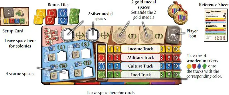 The cards you choose during both phases will allow you to increase your income, claim colonies, complete statues, feed your populace, or collect points.