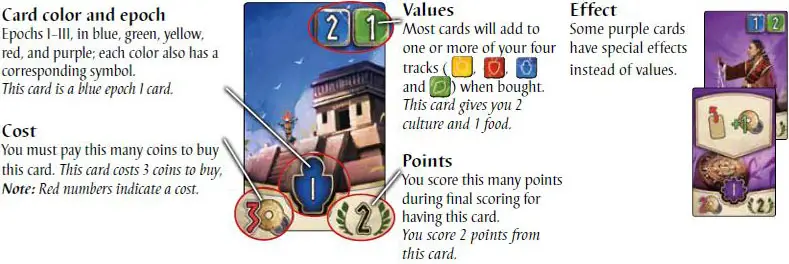 Most cards have values that add to one or more of your tracks. When you buy a card, move the markers on your tracks up based on the value(s) on the card.