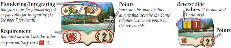 Starting with the first player and continuing clockwise, each player can take 1 colony that they fulfill the requirement for, either by plundering it or by integrating it.
