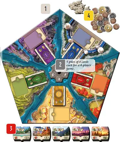 3 Separate the 25 colonies by the values shown in the bottom-left shuffle the 5 piles separately, then place 1 colony per player from each pile next to the board.