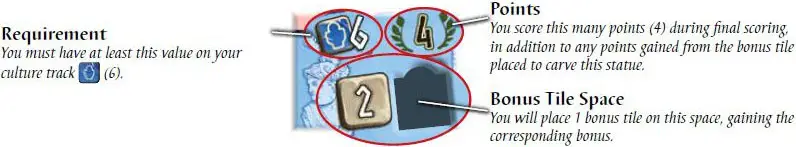 When you carve a statue, place 1 of your unused bonus tiles on your player board on the space corresponding to the statue that you just carved. You choose to either place the tile faceup, showing one of the four tracks, or facedown showing points (
