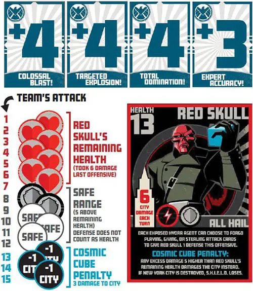 Cosmic Cube Penalty Example: Red skull has 7 Health remaining 2 HYDRA agents each gave Red Skull a Defense.