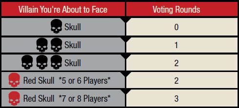Each time a Villain is Defeated, your team will move into a Knock Out Phase. The Knock Out Phase occurs before any new Missions begin. Do not flip over the next Villain until your team has completed the Knock Out phase. The amount of times your team will vote is determined by the Villain you are about to face. Refer to the chart below: