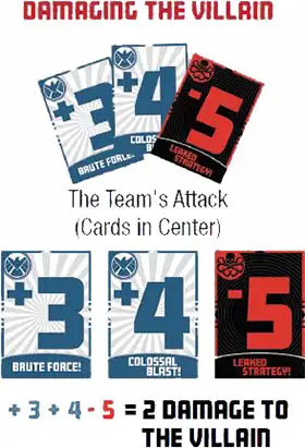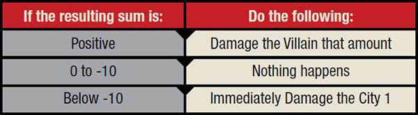 Collect all Heroes' face down Attack Cards, shuffle them, and reveal them. Total the values, then deal damage to the Villain if the resulting sum was positive. If negative, consult the chart to the left.