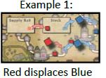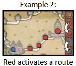 The activities of (1) placing a resource, (2) displacing a resource, and (3) establishing a trade route can only be taken on routes that are adjacent to the figure. However, the activities of (1) allocating resources or (2) moving resources are not restricted by the figure.