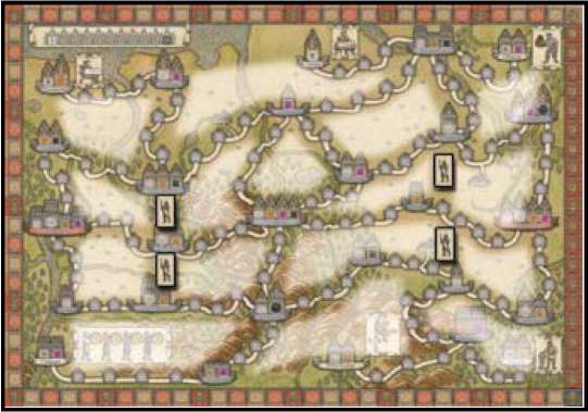 The board is considered to be divided into 16 provinces. The borders are marked by both the trading routes and the position of the border guards, which are placed on the board as shown to the left (between Osnabruck and Munster, Munster and Dortmund, Luneburg and Bruinswiek, Bruinswiek and Goslar).