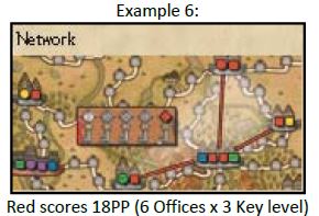At the end of the game the player's largest network of connected Offices count the indicated amount of prestige points per Office. See Scoring (f) below.