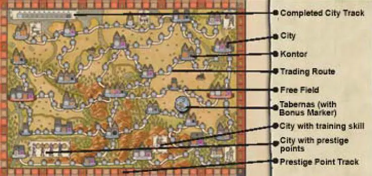 Trade routes located between these cities contain two to four field spaces where either a trader or a merchant can be placed to establish trade routes. Five cities (Groningen, Stade, Lubeck, Gottingen and Halle) show pictograms of particular trading skills which may be enhanced if a trading route is established there by a player.