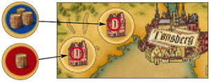 To accomplish this, the player pays 1 Taler to the bank. He then takes the Goods Markers, one at a time, from the first Supply Space on which any Markers remain and places them face up onto the empty Warehouse Spaces. Warehouse Spaces are filled in numerical order.