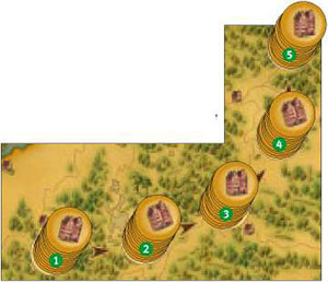 Example 2: There are five Supply Spaces shown in the lower right-hand corner of the Game Board. This is where the remaining Goods Markers are placed in face-down piles.
