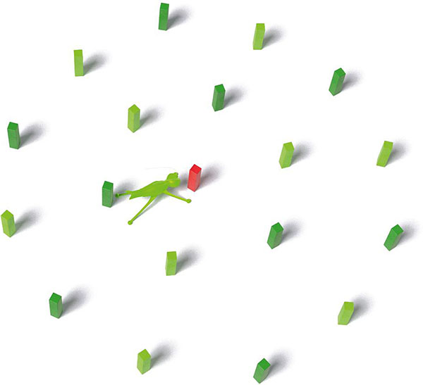 An important note: Throughout the course of the whole game, the grasshoppers cannot be repositioned! Wherever the grasshopper lands is the place where it should jump from next.