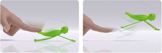 To make the grasshopper jump into the air, you press down on its two wingtips with your finger and then let go. The first team launches its grasshopper.