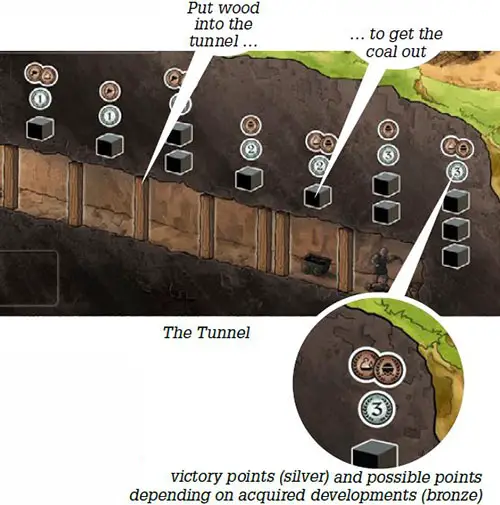 The tunnel scores victory points at the end of the game. Players will receive victory points depending of the completed areas in the tunnel. Each completed area provides 1 to 3 victory points.