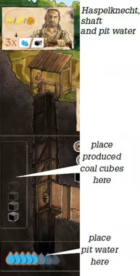 The Haspelknecht only works if he is paid. When paid, he can perform up to 3 ac- tions. Per action, he can remove 2 pit water from the shaft or excavate 1 coal back to the surface.